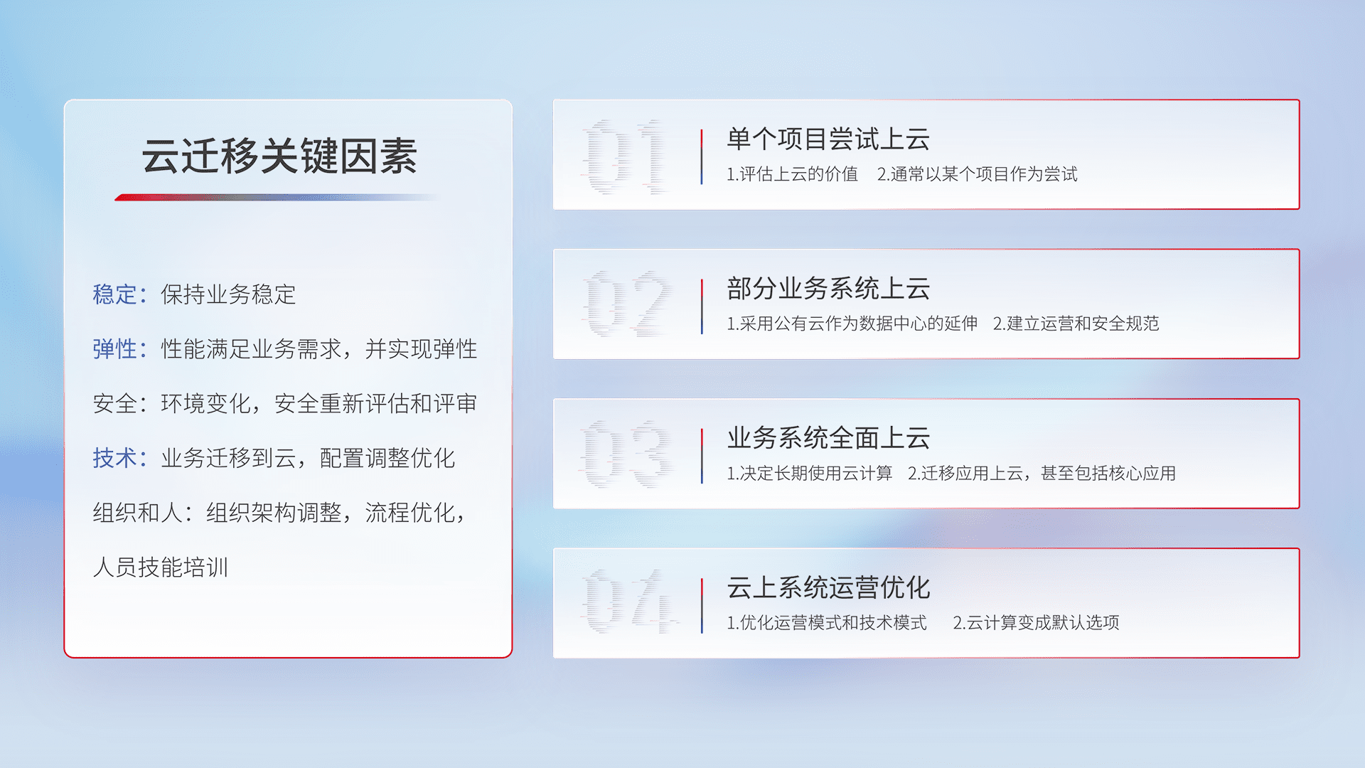 结合实际业务,,,从规划设计、、、云平台选型、、、、云原生改造、、、数据迁移、、、、集成交付,,,,迁移全过程为客户识别最佳上云路径,,做好风险识别管理,,设计网络架构、、身份权限、、安全审计合规、、操作审计、、、日志审计、、、、监控告警策略、、多站点容灾设计等,,,对云上基础设施进行整体规划,,,提升IT治理水平,,,以满足弹性、、、、高可用、、高性能的需求。。