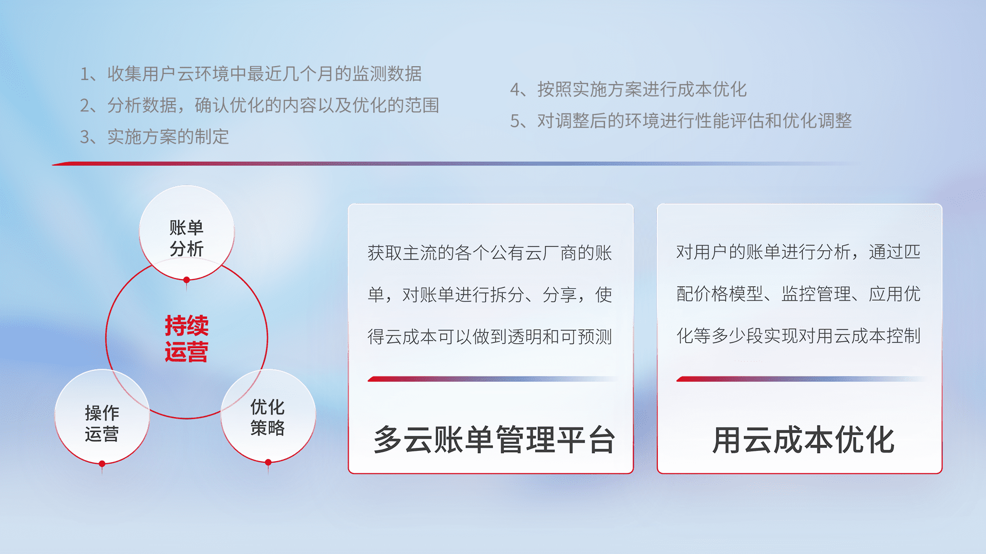 通过灵活运用多种自动化迁移工具,,,帮助企业用户实现业务和数据高效 、、、稳定的上云迁移和云上迁移,,,,采用自研多云纳管平台,,,以中立管理模式,,,,解决多组织、、、、多云、、多运维厂商的复杂关系的管理,,保证多云平台资源配置的一致性,,,,实时掌控云资源运行数据,,运用智能化工具分析云资源多云平台的管理服务,,透明化管理成本支出,,用云成本可预测、、、、用云费用可优化、、、、云资源配额有据可依。。。。